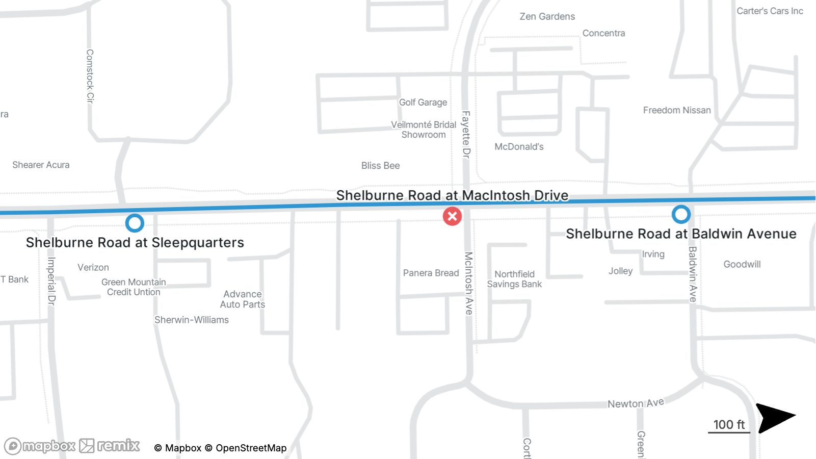 Due to a water main break, buses cannot access the stop on Shelburne Road at MacIntosh Drive. Riders should utilize stops on Shelburne Road at Sleepquarters and Baldwin Avenue.